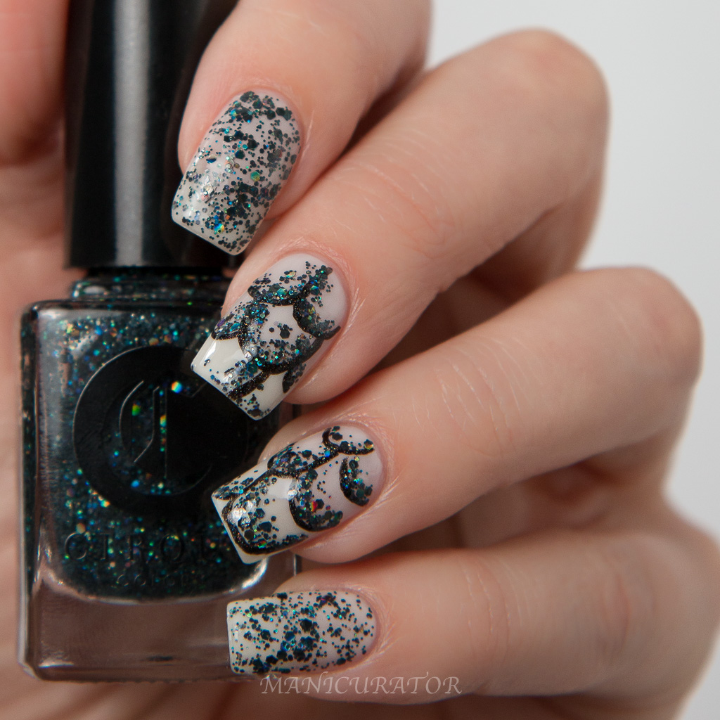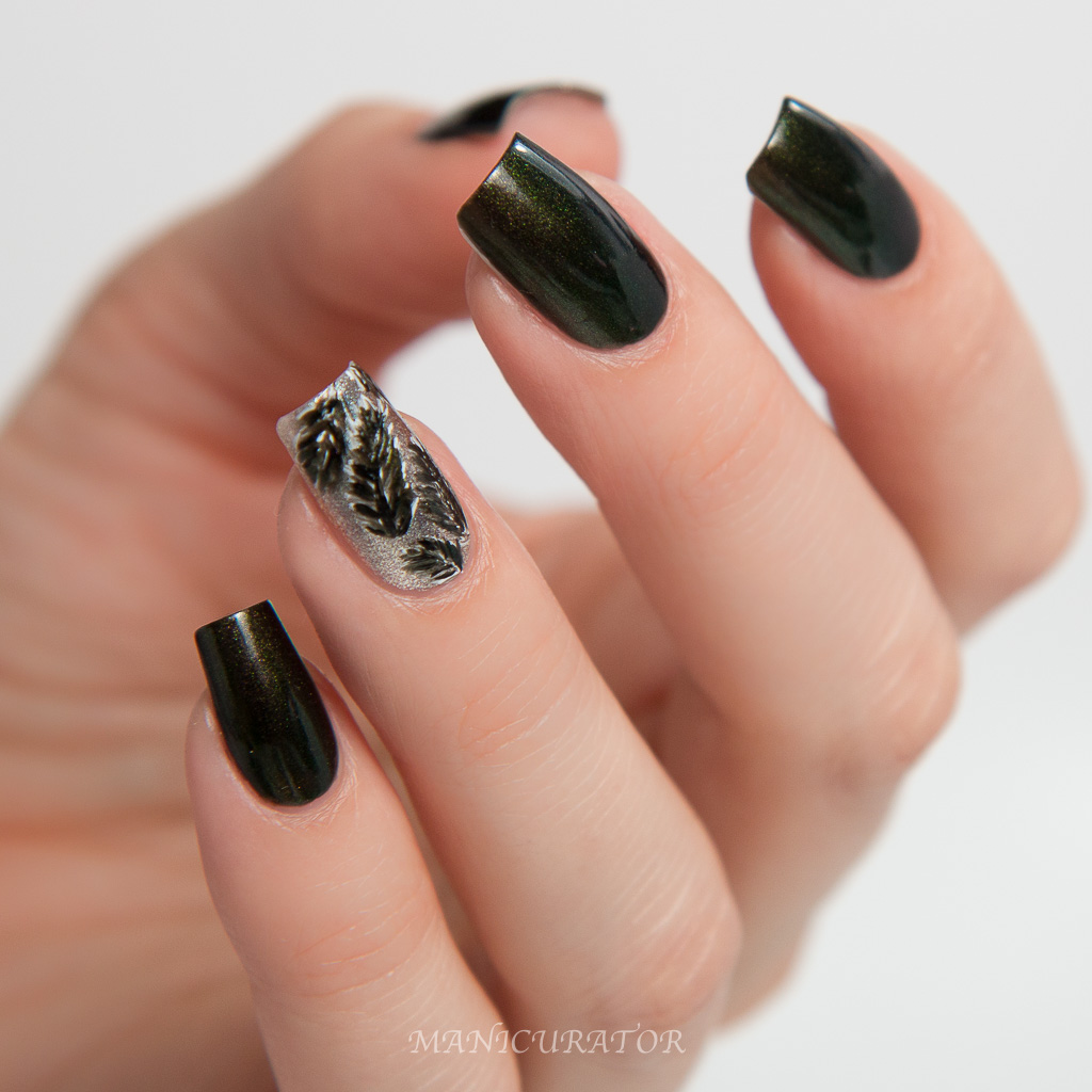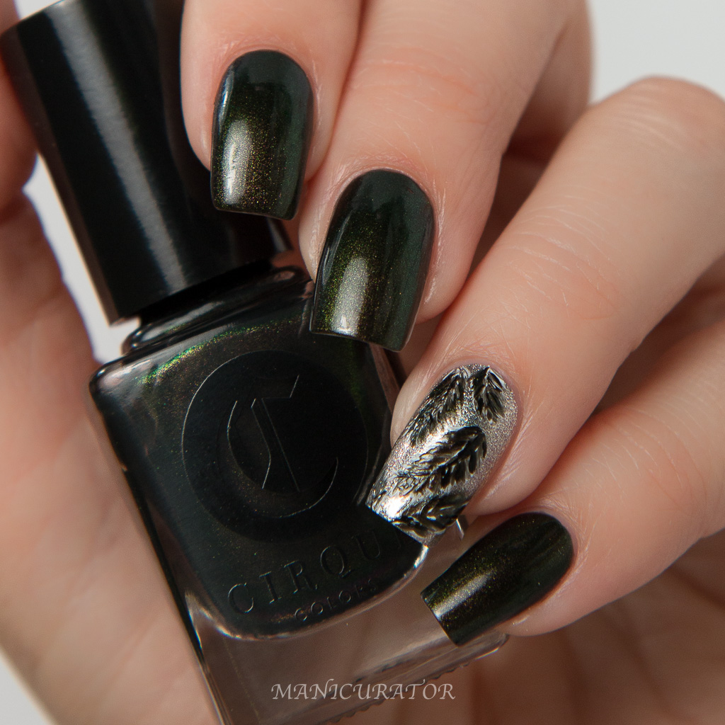 A brooding shade with hints of brown, black and green that looks different at different angles. No problems with formula or application. I used 3 thin coats for the swatch nails. The design is freehand with a small nail art brush using Cirque Colors Carpe Diem, Raven, then Memento Mori over Moon Dust. No top coat for this manicure.