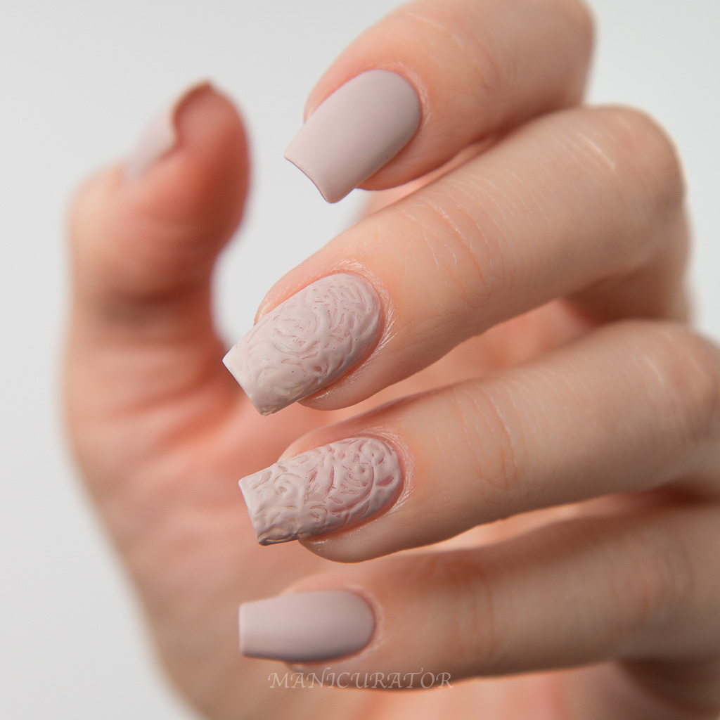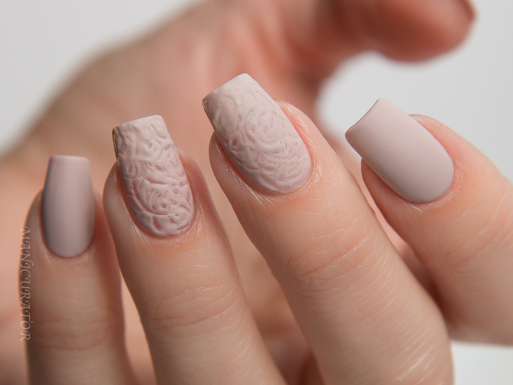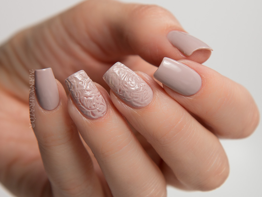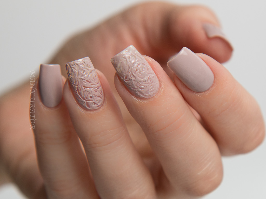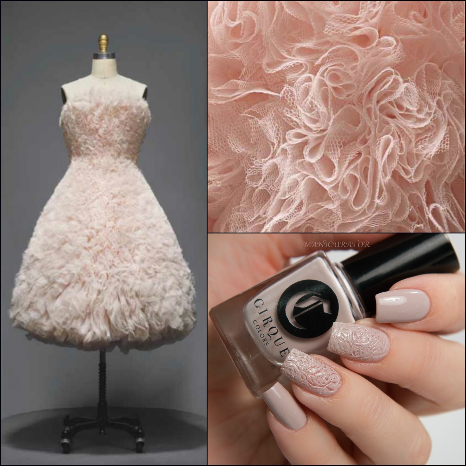 This shade is more beige than the pink that the promo photo (above) shows. It has an excellent formula and is opaque in 2 coats. Easily became a new favorite neutral for me. I wanted to capture the texture and seemingly ordered randomness in the above fabulous dress. I tried quite a few different techniques until I got this one that I was pleased with. I simply used the pointy smallest dotting tool I have to make these swirls and figures 8's onto freshly painted nail. As I swirled, the paint began to dry down, allowing the design to take hold.