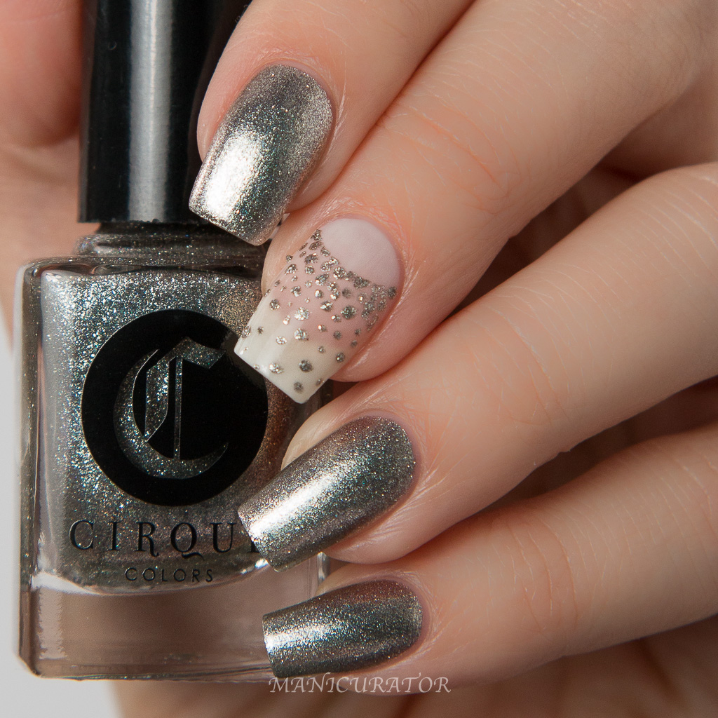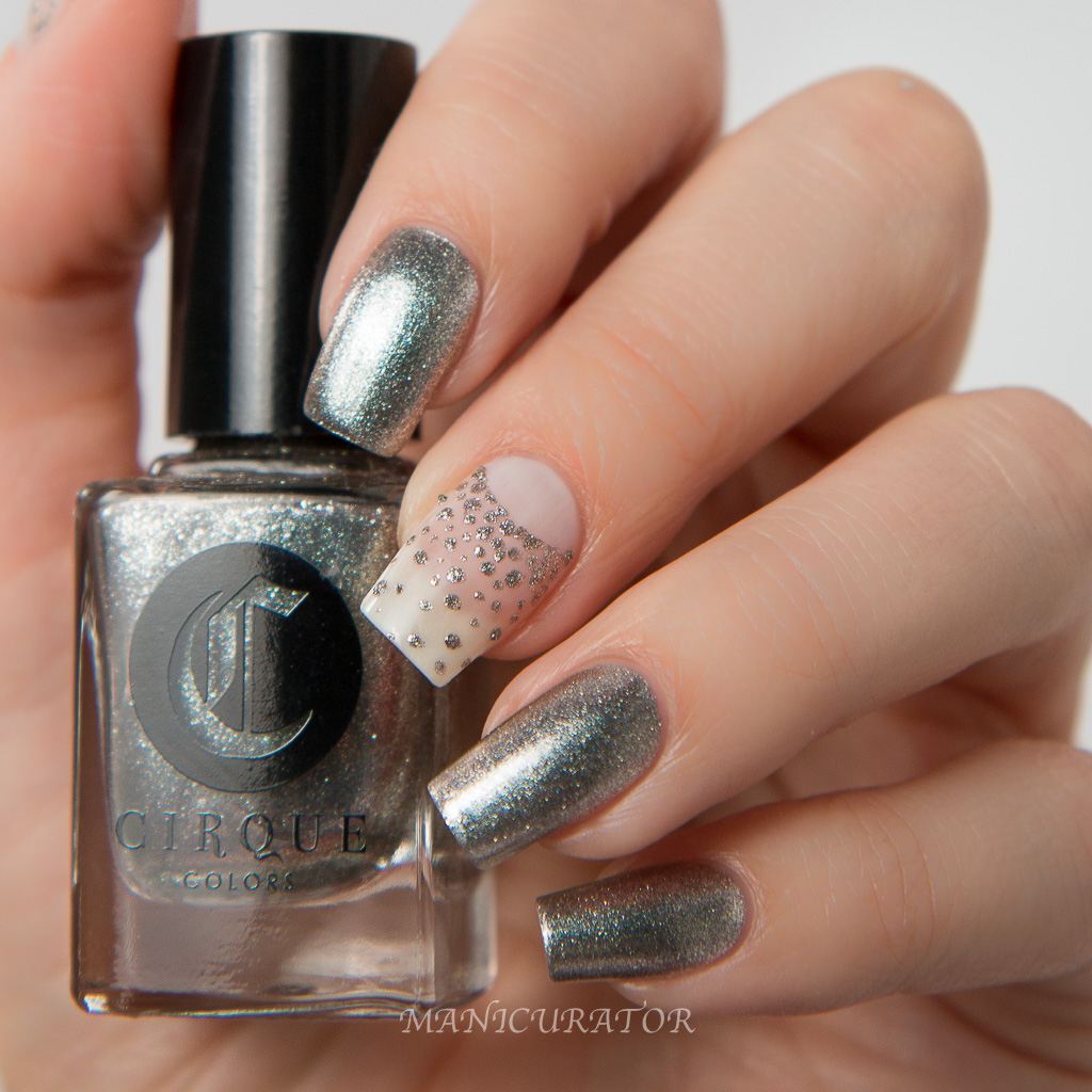 My personal favorite of this collection. This shade has a great formula, and opaque in 2 coats. I used 3 here, just to be on the safe side. In my opinion, this is a grown up glitter that is very unique, as it does show off a pink iridescence. Swoon! To create this simple and elegant nail design I first applied 2 coats of Cirque Colors Ultrasonic and then fast dry top coat, then used What's Up Nails Circle Tape Nail Vinyls to block off the moon and used a dotter to make gradient dots down the nail. No top coat over the dots!