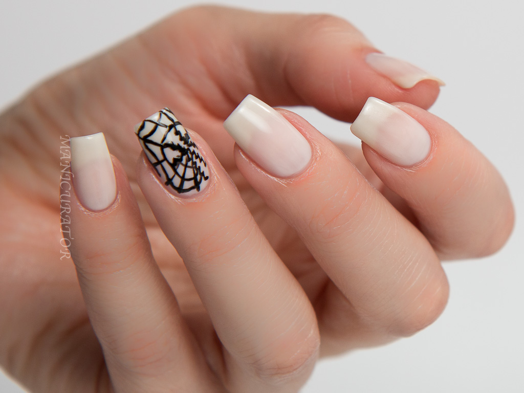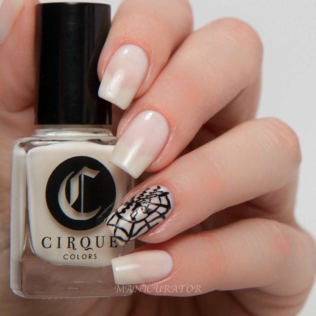 This is a gorgeous crelly formula, where you can apply one coat for a hint of sheer brightening off white or build it up for more coverage. My swatch nails have 3 coats and you can still see the nail line. I love it and love the formula. I know I will pick this one up again and again for nail art as well. The design was done free hand with Cirque Colors Memento Mori to give the feel of this funky modern fashion artwork.