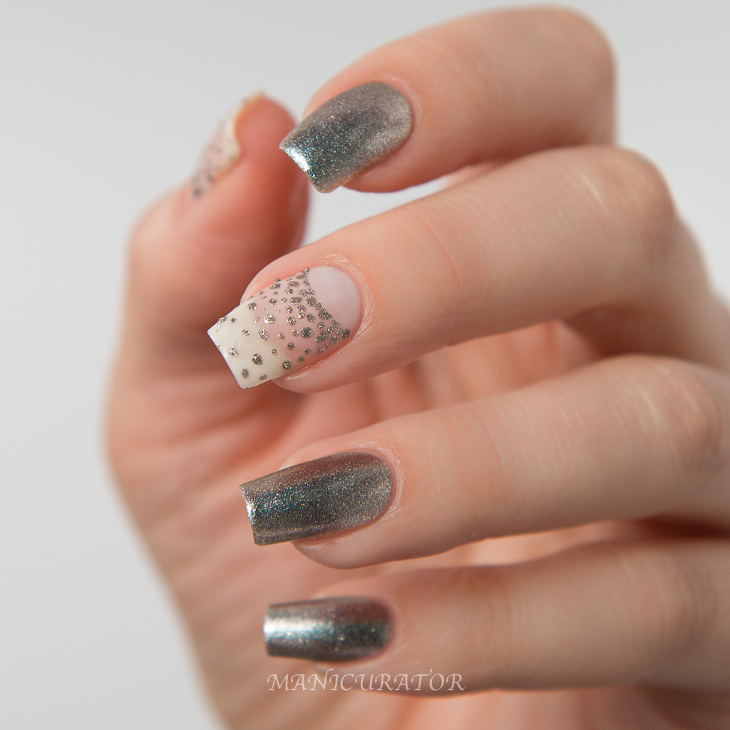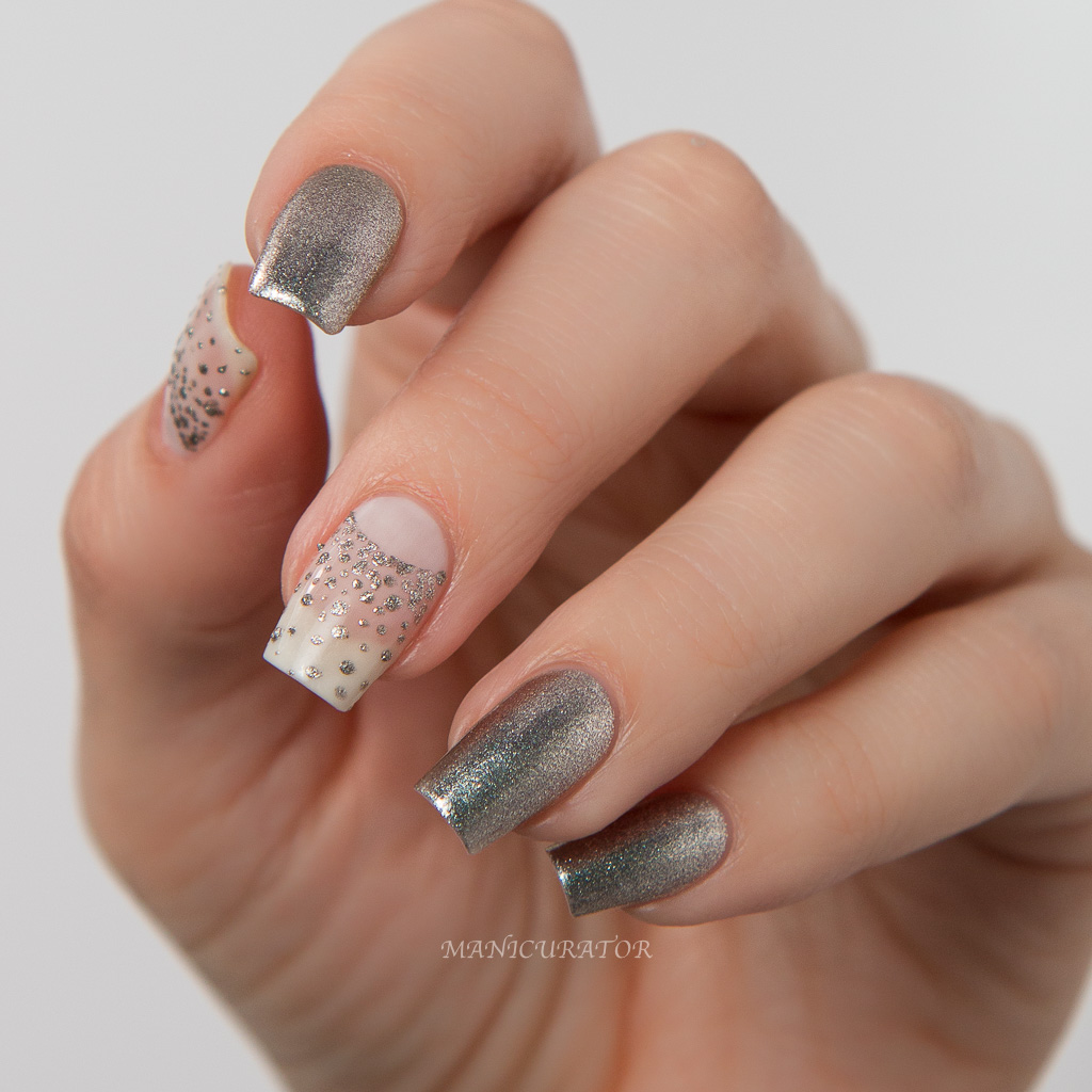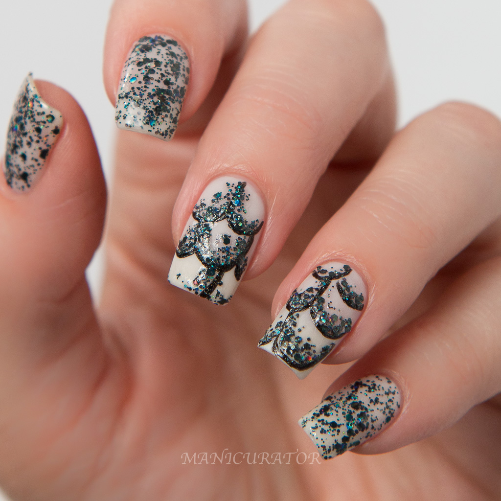 An easy glitter to work with. I had no issues with formula, application and no fishing for glitters necessary. To create this design I applied 3 coats of Cirque Colors Ultrasonic and fast dry top coat. I used a small nail art brush to paint the outline of the dress using Cirque Colors Alter Ego. Then I dabbed on glitters from Laser Jet along the outlines. On the swatch fingers, I painted on 1 coat of Laser Jet over 3 coats of Ultrasonic and dabbed some glitters where I wanted a bit more coverage.