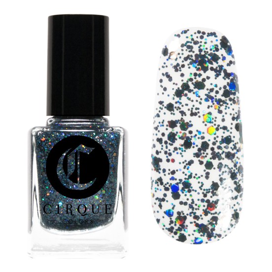 Cirque Colors LASER JET Limited Edition: A sparkling black holographic glitter topper that can be used alone for opaque coverage or layered for a shimmering effect. This high-tech lacquer is inspired by the machine-like perfection achieved in hand-beading and embellishment of both couture and prêt-à-porter garments.