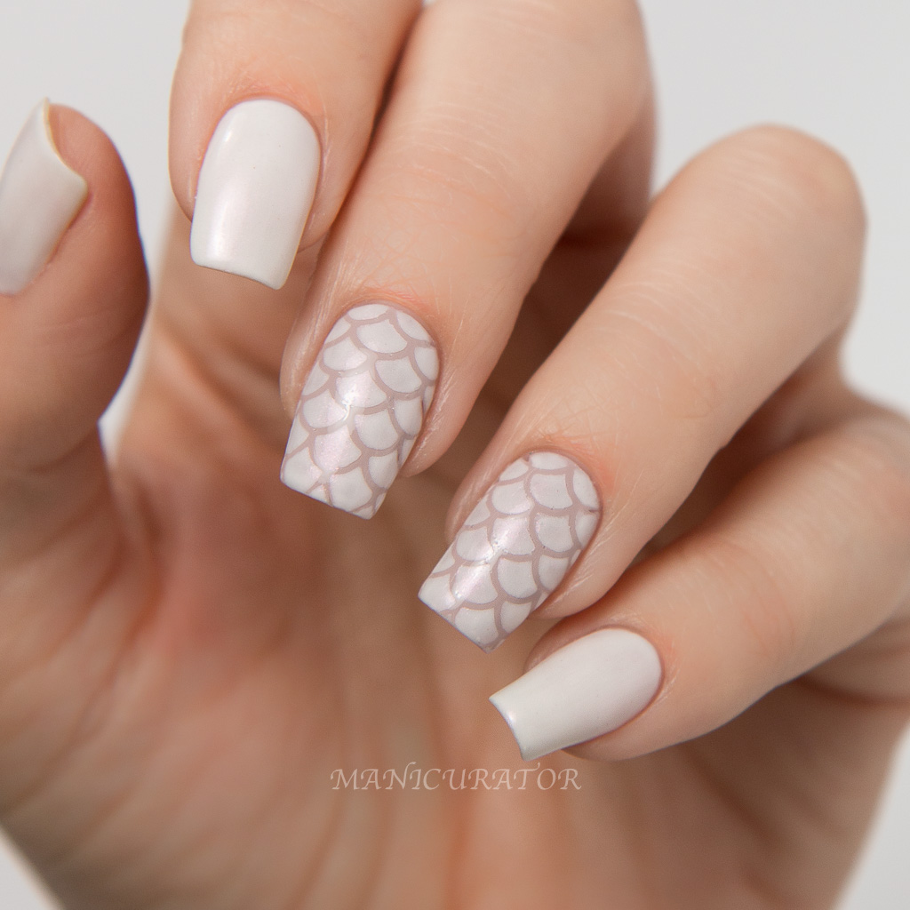 Beautiful white with a pink shimmer that I haven't quite seen in a polish before. I love it. White pearlescence formulas tend to be trickier to apply so I would recommend using 3-4 thin coats to get full coverage. A good top coat will smooth it out perfectly. For the nail design I applied 2 coats of Cirque Colors Tulle and fast dry top coat. Then I used Whats Up Nails Scale Vinyls and 2 thick coats of Pret-A-Pearl.