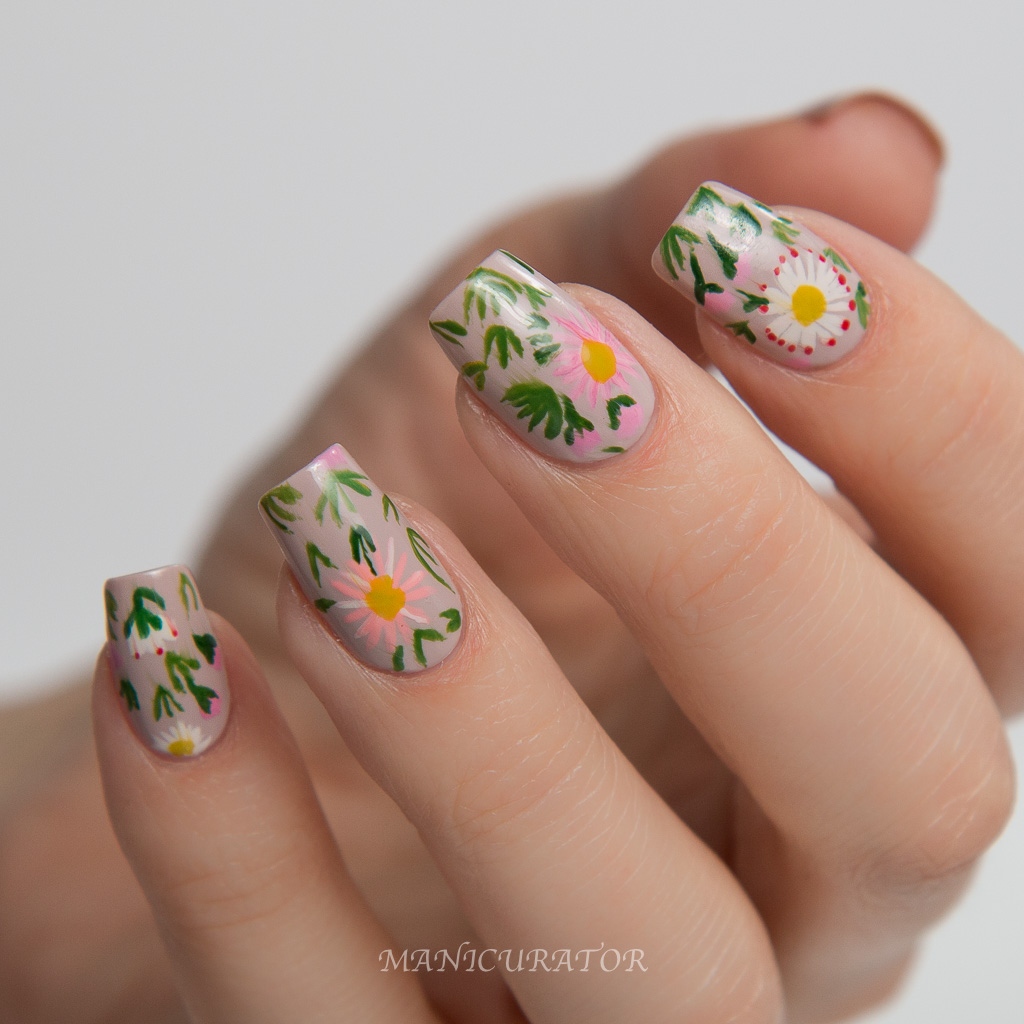 Using a small spotter brush I dabbed Cirque Colors Hustle in the center of the large flowers. Then I went back in with the small round brush using Cirque Colors McKittrick and McKittrick mixed with Hustle to paint in the leaves. I dotted Cirque Colors Rita on two of white flowers and that's it.