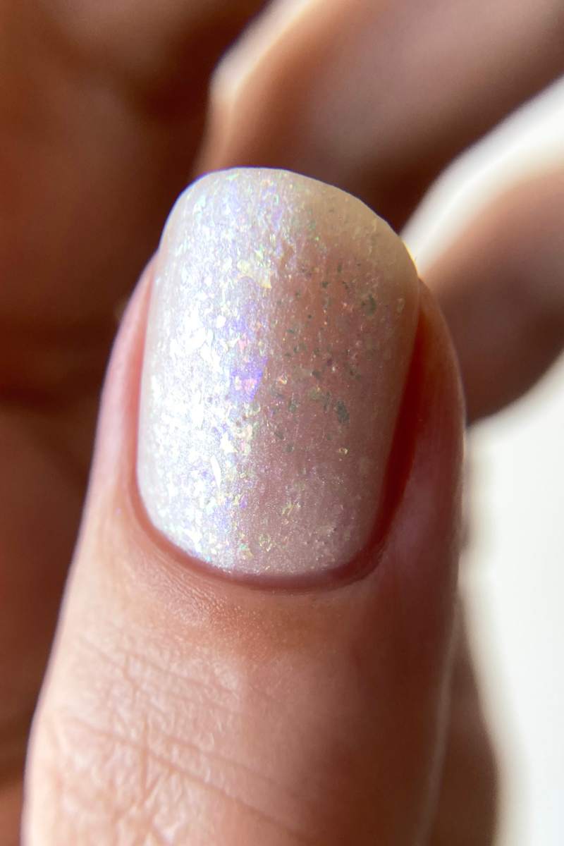 Liminal Light is a limited edition opal-inspired, white sheer nail polish with a mix of blue-violet iridescent flakes and pearlescent shimmer. Layer this over a base color or wear it alone for a sheer opal effect.