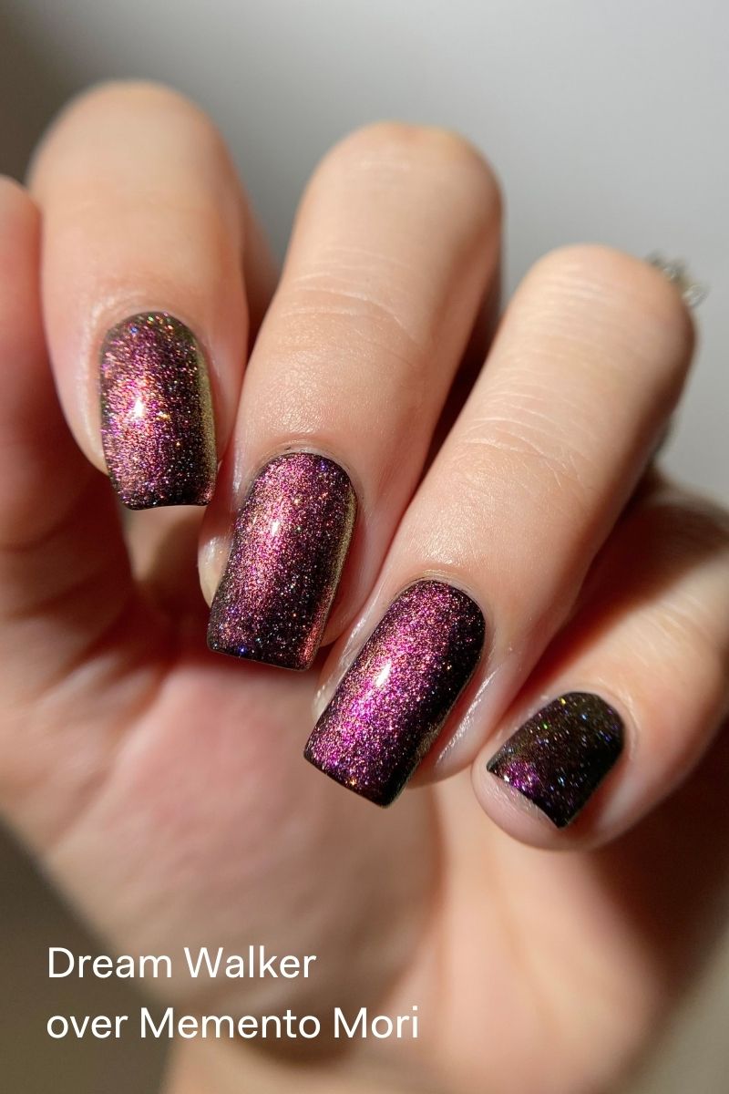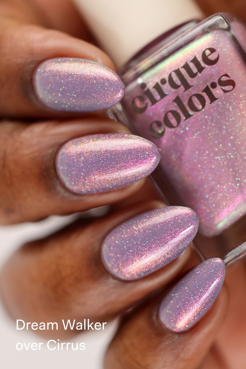 Dream Walker is a sheer purple-tinted nail polish topper with a fuchsia pink-gold-green color-shifting aurora shimmer and a delicate holographic sparkle. The lightweight, translucent formula makes it ideal for layering, soft washes of color, and ethereal nail looks.