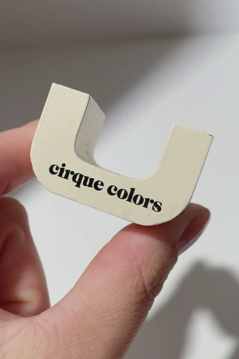 HORSESHOE: Before starting your manicure, carefully remove the base metal plate from the magnet by pushing it off with your thumbs. Apply 1-2 thin coats of magnetic nail polish to desired opacity and let dry. One nail at a time, apply a thick coat and immediately place your finger in the u-shaped groove for 30-60 seconds. Experiment with rocking your finger back and forth or side to side to alter your magnetic design. Alternatively, flip the magnet upside down and rest your finger on top while applying a thick coat. This will create a slightly different magnetic design. Be sure to rest your finger on the magnet for 30-60 seconds. Once dry, apply top coat, repeat your finger placement on the magnet and hold for an additional 30-60 seconds to keep the design in place.