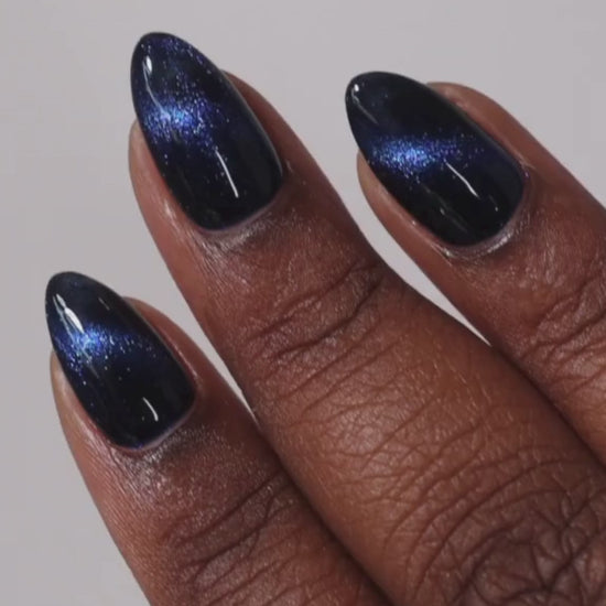 Follow these easy steps or watch our video tutorial to re-create this look. Apply 1-2 thin coats for desired opacity and let dry. One nail at a time, apply a thick coat, and immediately hold the rectangular end of your magnetic wand at an angle over the center of your nail for 30-60 seconds. Alternatively, hold or rest your finger on the magnet while applying a thick coat. This will instantly create a cat eye as you apply the polish. Be sure to hold or rest your finger on the magnet for 30-60 seconds. Once dry apply top coat and hold the wand for another 30-60 seconds to keep the design in place.