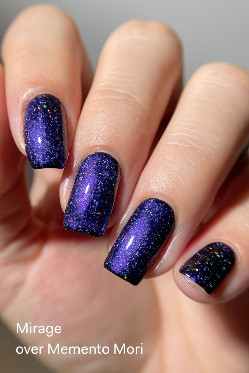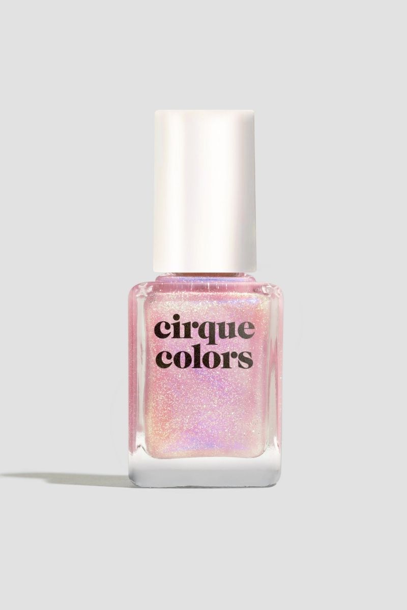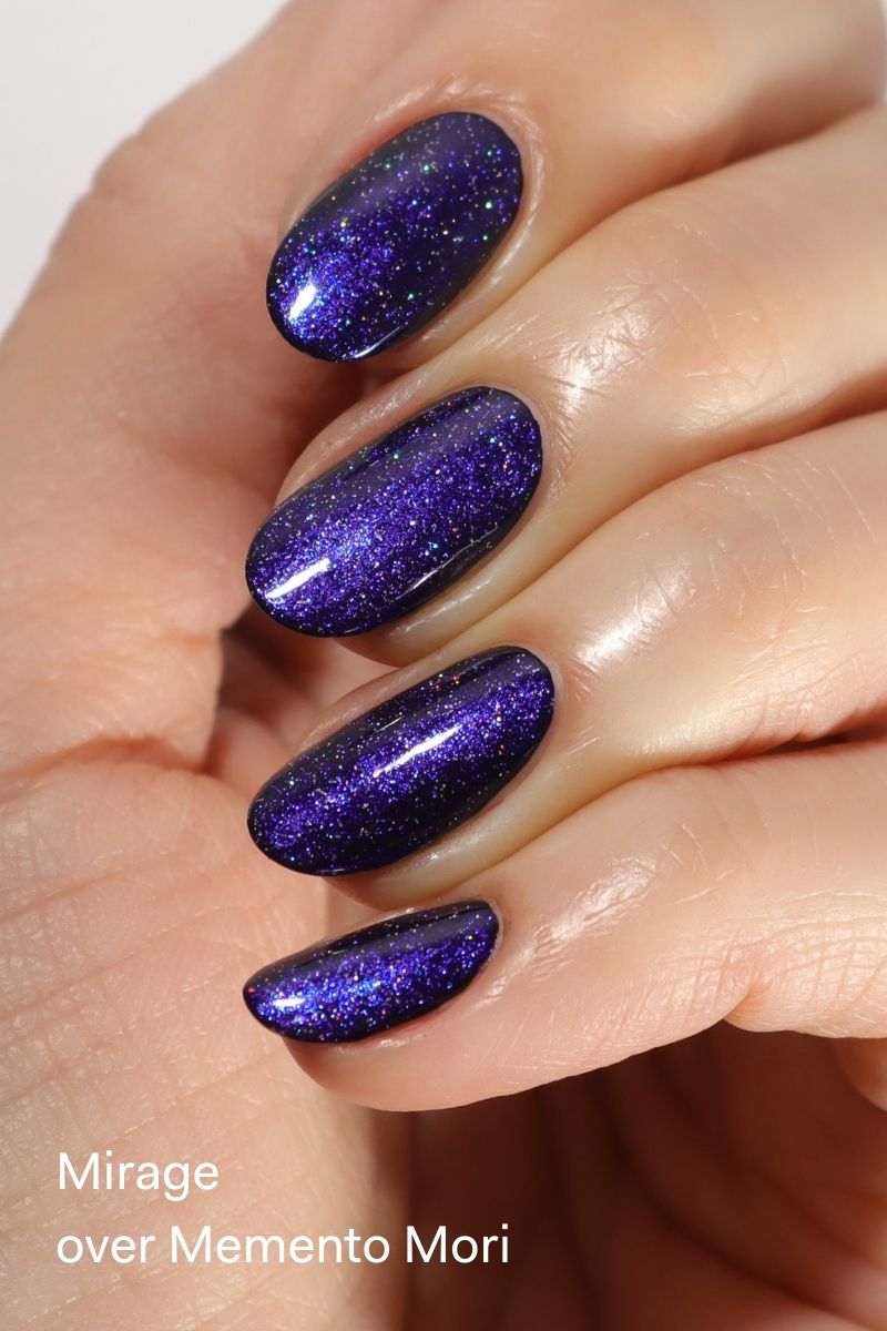 Mirage is a sheer pink nail polish topper with blue-violet color-shifting aurora shimmer and delicate holographic sparkle. Designed to enhance natural nails or layer over other shades, this topper adds a soft, glowing veil of light.