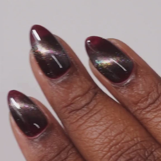 Follow these easy steps or watch our video tutorial to re-create this look.- Apply 1-2 thin coats for desired opacity and let dry.- One nail at a time, apply a thick coat, and immediately hold the rectangular end of your magnetic wand at an angle over the center of your nail for 30-60 seconds.- Alternatively, hold or rest your finger on the magnet while applying a thick coat. This will instantly create a cat eye as you apply the polish. Be sure to hold or rest your finger on the magnet for 30-60 seconds.- Once dry apply top coat and hold the wand for another 30-60 seconds to keep the design in place.