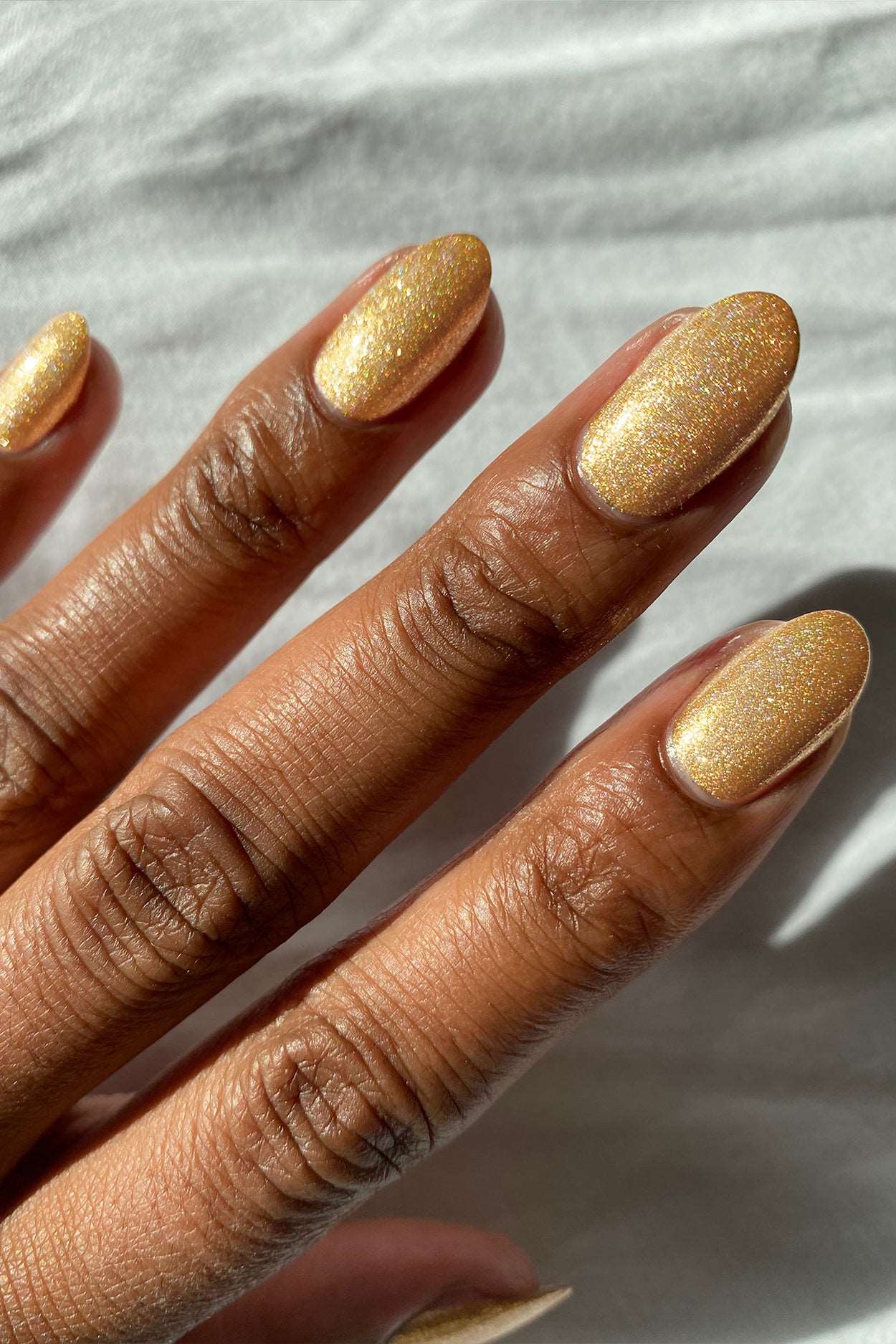 24K Affair is a sparkling yellow gold holographic nail polish. This polish is made with special metallic pigments that gives it a shiny, reflective finish.