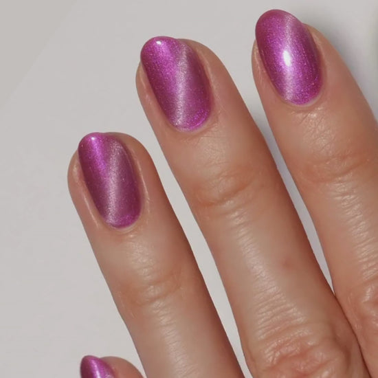 WAND: Follow these easy steps or watch our video tutorial to re-create this look. - Apply 1-2 thin coats for desired opacity and let dry. - One nail at a time, apply a thick coat, and immediately hold the rectangular end of your magnetic wand at an angle over the center of your nail for 30-60 seconds. - Alternatively, hold or rest your finger on the magnet while applying a thick coat. This will instantly create a cat eye as you apply the polish. Be sure to hold or rest your finger on the magnet for 30-60 seconds. - Once dry apply top coat and hold the wand for another 30-60 seconds to keep the design in place.
