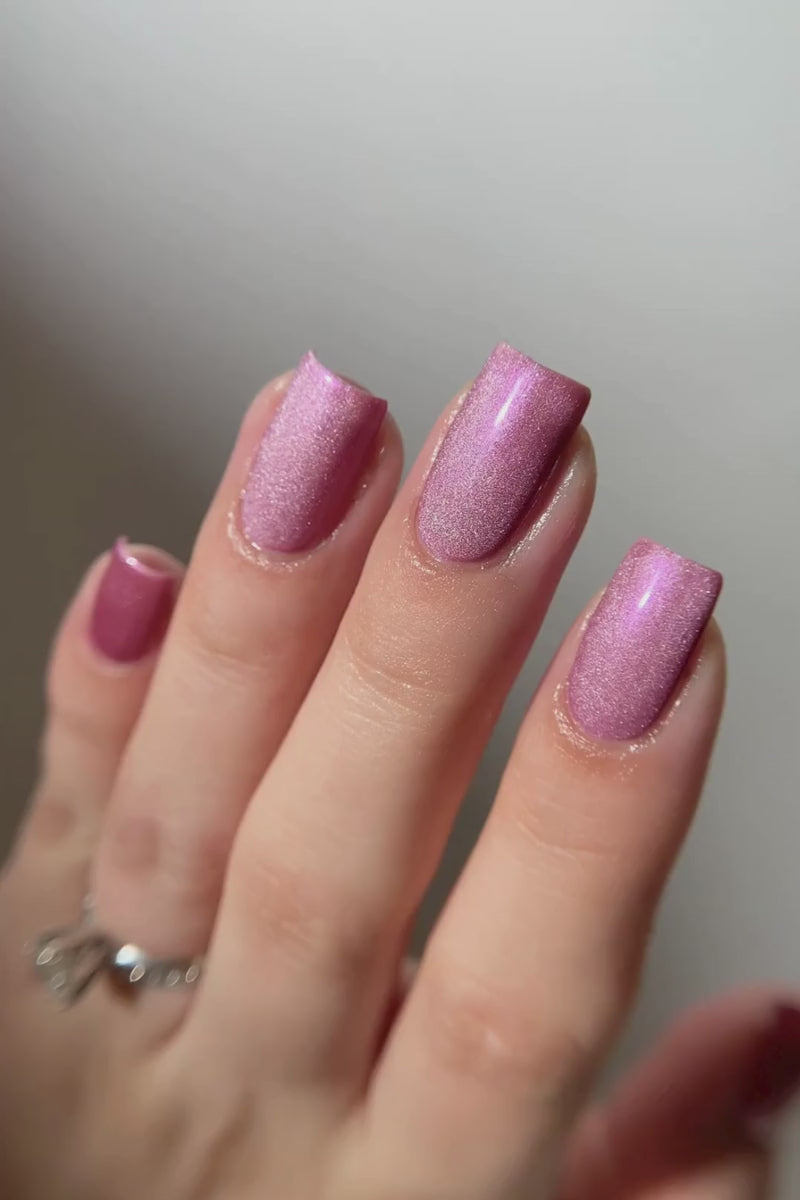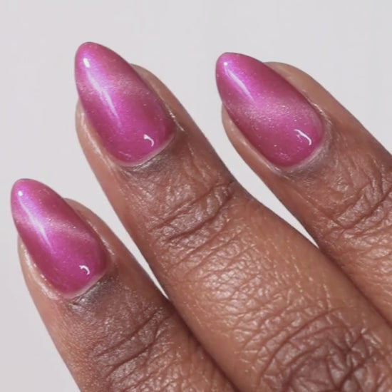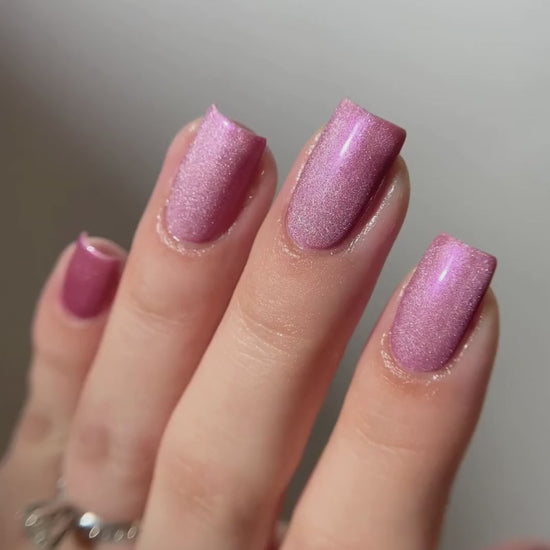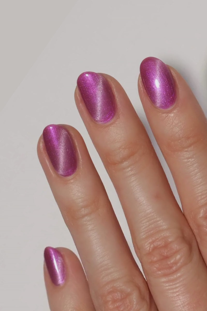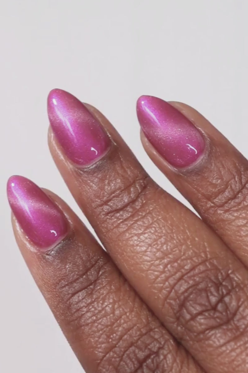Bloom feels like spring showing off. It’s the color of fresh petals, flushed cheeks, and the first bouquet you buy just because you can. The fine magnetic pigment creates a glassy, frosted effect that looks smooth and compact on the nail, especially in direct light. Cat-eye it for a sharp streak of shine, or velvet it for that soft-focus glow that looks like it belongs in a slow-motion video.