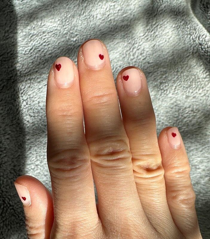 Nice, easy to use formula with no streaking. Great as a base for nail art or a french mani. I used 3 coats here and added scattered red glitter hearts.