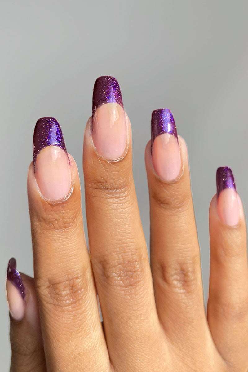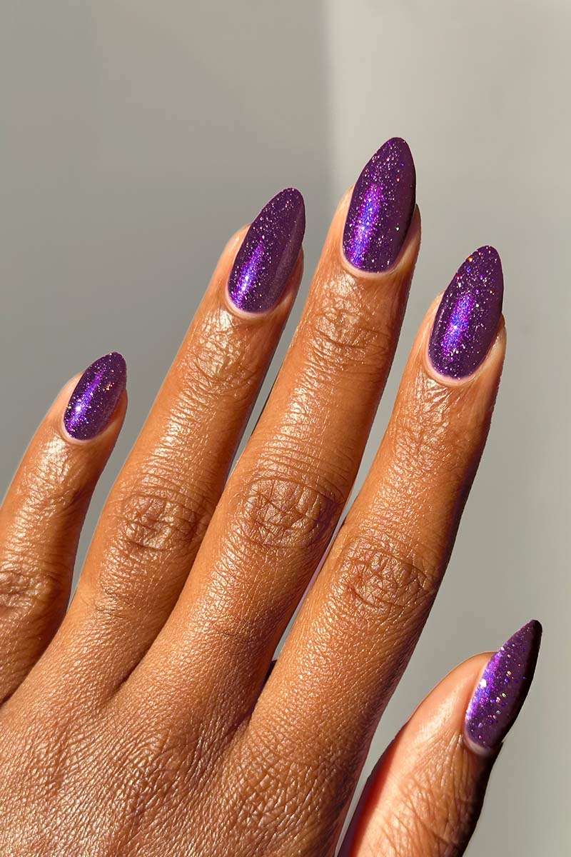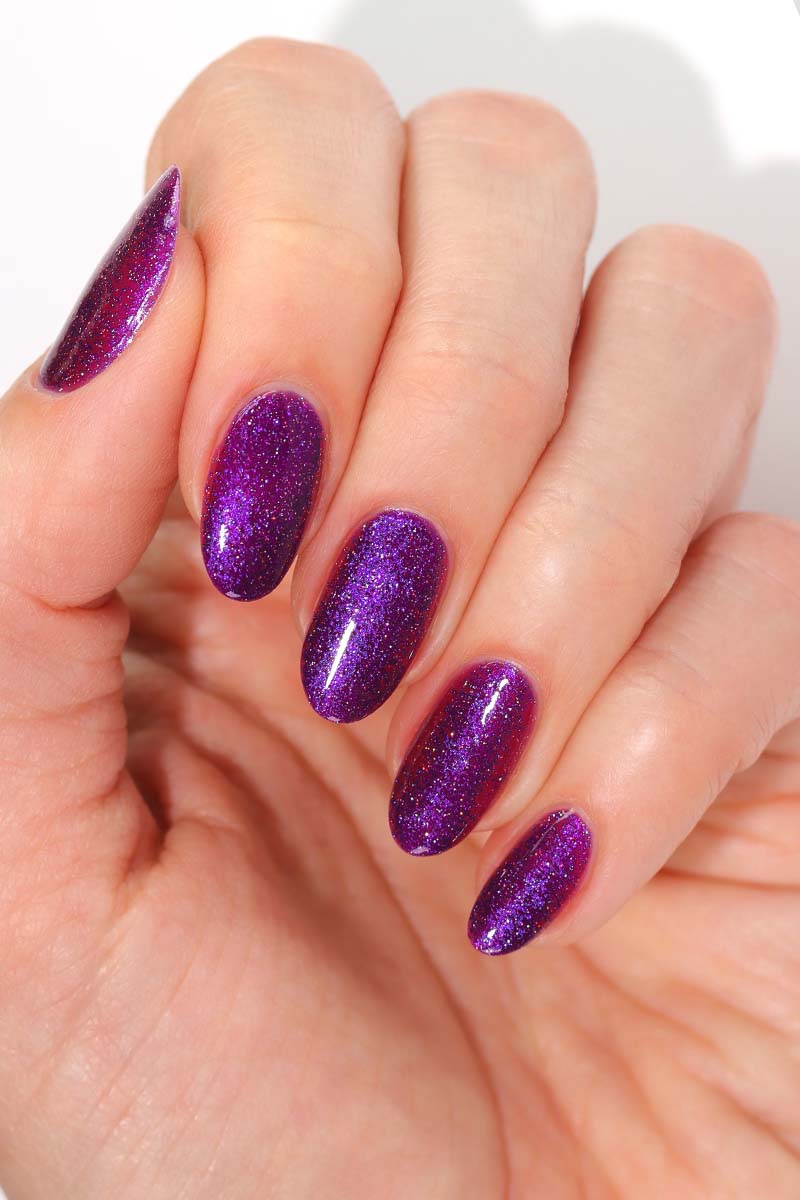 Dragon’s Dungeon is a oxblood red Shimmergraphic™ nail polish with an indigo blue-purple color-shifting aurora shimmer and an intense scattered holographic effect.