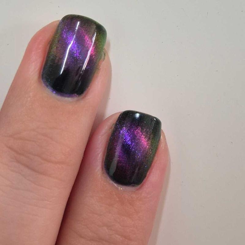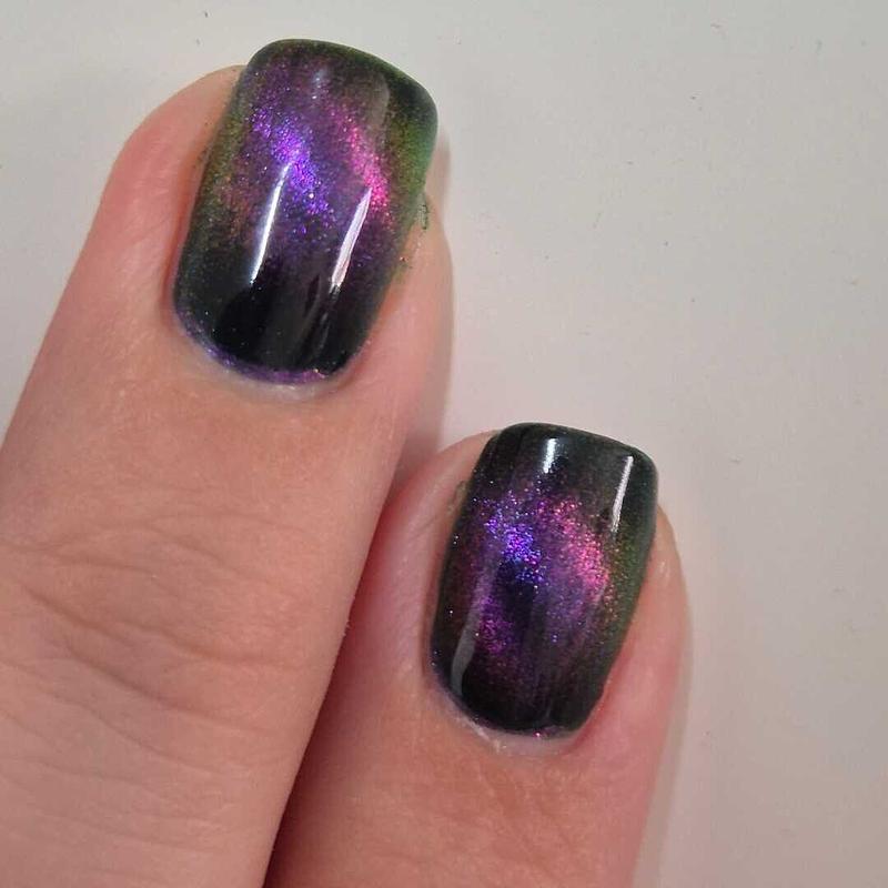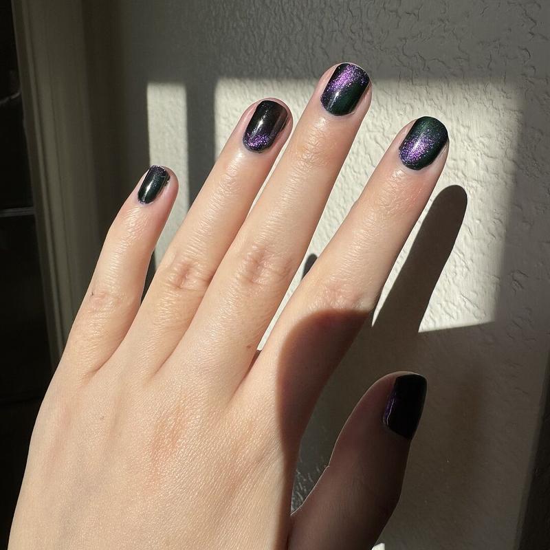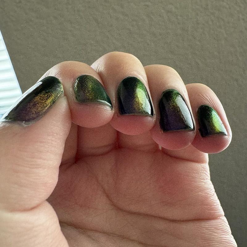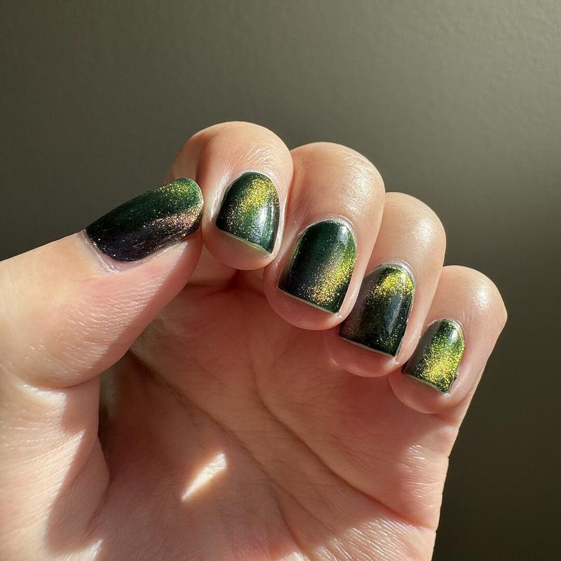 This one’s very pretty! The formula is great and magnetized easily. The magnetic pigment is super shifty, it’s pink head-on and turns yellow and green at extreme angles. I wish the base was a lighter green though. It’s too dark and looks black unless you’re in direct sunlight.