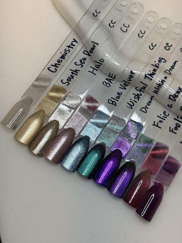 Gorgeous, moody shiftiness from a purply magenta to forest green to orange-gold! I velvetized every finger except my ring finger which is cat eyed in my review photo. It is taken on day 5 of wear on my non-dominate hand for context.