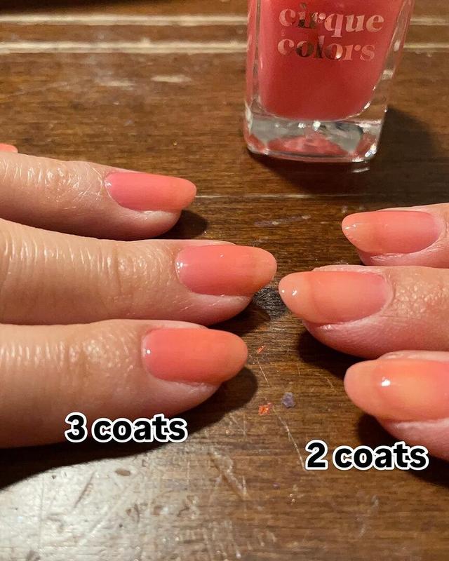 A nice sheer jelly. For me, 2 coats for a soap nail look and 3 coats for the color to pop more. The paddle brush is great and the formula was smooth and self-leveling.