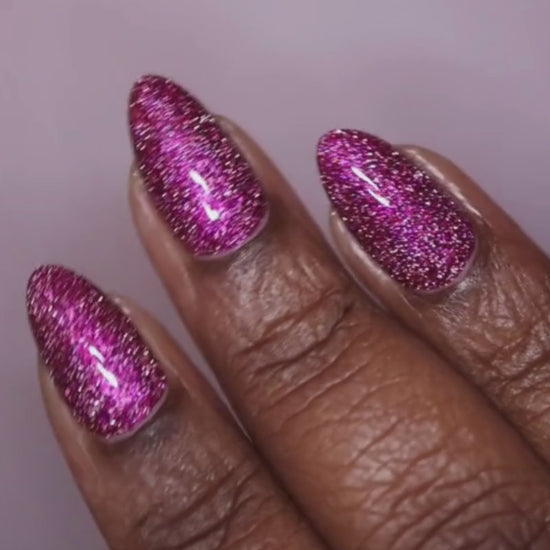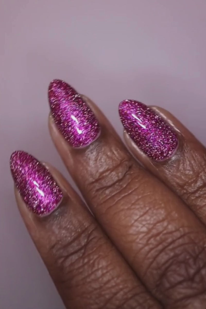 La Rougeanne is a deep black cherry red nail polish packed with a pink-gold-green color-shifting aurora shimmer, dazzling reflective silver sparks, and an additional scattered holographic sparkle. The result is sultry, rich, and endlessly eye-catching.  Our Spotlight Shimmers™ combine glimmering shimmer pigments and flash reflective glitters which illuminate your nails with direct lighting.