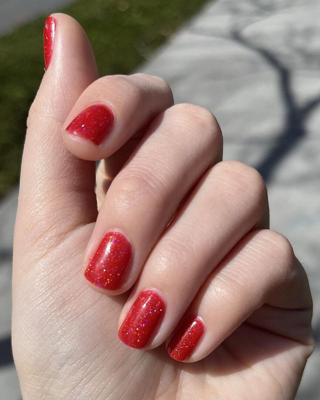 I am not a red polish wearer, I use red almost two times a year, but this definitely became a favorite and I want to use it more frequently! Great formula, holo the sparkles so so much, and a lovely shade of red, it makes you feel powerful!