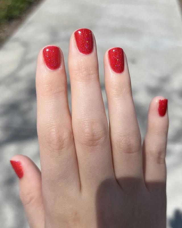 Red Bttms is a red holographic nail polish with a scattered holographic effect.